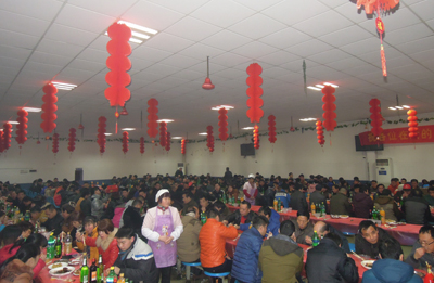 春節前夕,集團公司行政、工會組織各事業部分工會對全體員工進行摸底調查,最終確定留守杭州過年的有500多名外地單身員工,為了讓他們在杭州過一個歡樂、溫暖、祥和的新春,公司與往年一樣,為他們舉辦“同吃年夜飯,歡度除夕夜”活動。為此,公司還在食堂掛起了大紅燈籠、彩帶等,增加了節日的喜慶氣氛。