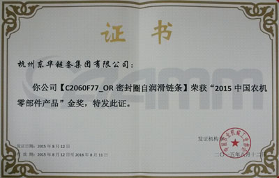 會上,與會人員主要圍繞會議主題進行技術、市場、創新、發展等廣泛交流。會議期間,評比并頒發了2015中國農機零部件46項金獎產品和25項創新獎產品。東華申報的C2060F77_OR和C2062H_ORSDF1密封圈鏈條經久保田、福田雷沃等知名整機企業的推薦,專家委員會最終評審決定,對 東華申報的這兩款密封圈鏈條分別授予金獎和創新獎。這個獎項是目前農機鏈條企業的最高榮譽,體現了東華農機鏈條處于國內同行領先水平,得到廣大農業主機單位的贊譽和認可。東華生產的農機鏈條也暢銷國際市場,與CLASS、紐荷蘭等世界500強企業配套。