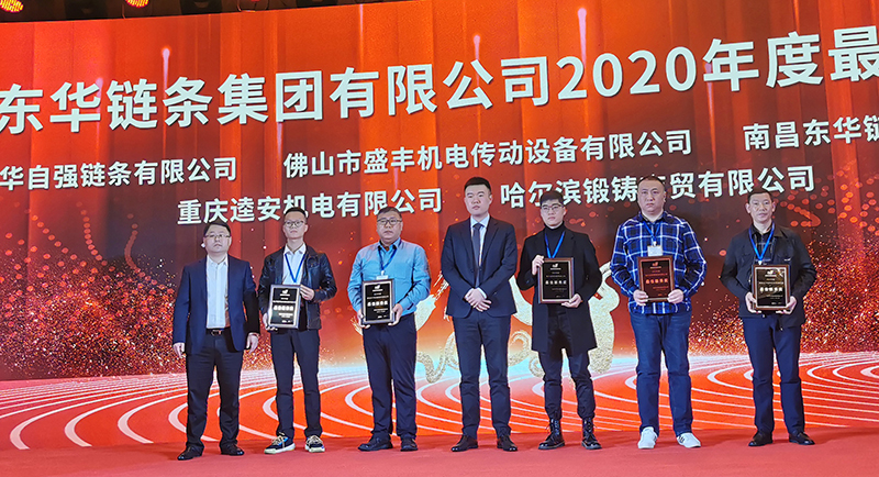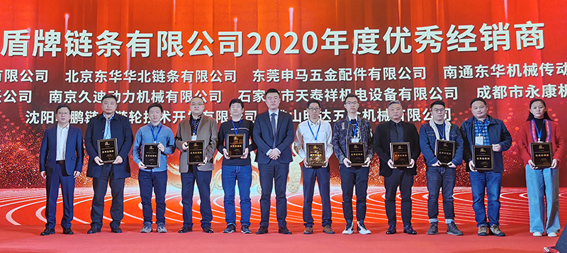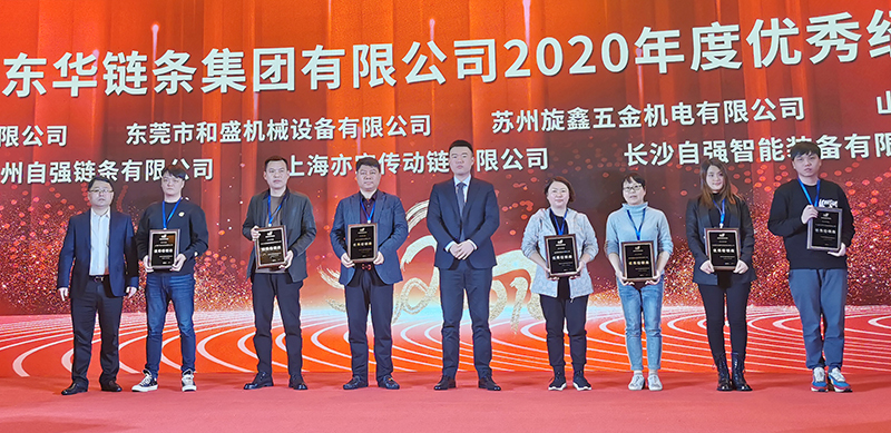 為感謝陪伴東華一路成長,一起拼搏的合作伙伴們,會議隆重表彰了東華15家優秀經銷商、5家最佳新秀獎;盾牌公司10家優秀經銷商,董事長宣成向獲獎單位頒發獎牌并合影留念。