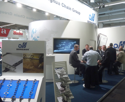 本屆展會中全球前三大農機主機企業John-Deere、CLAAS、CNH展臺規模最大,人氣最旺。從展會上主機設備所配套的鏈條來看,東華鏈條產品已深入農機主機市場,如東華牌驅動鏈、喂入鏈、提升鏈、玉米鏈等,在某些主機企業占比達50%以上,某些知名主機企業均用東華鏈條,占比100%。