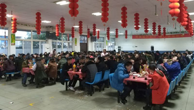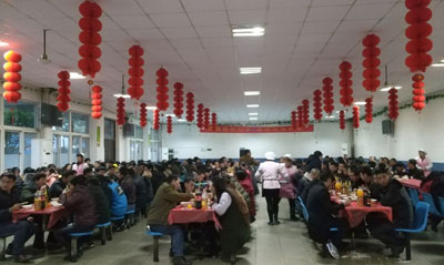 1月25日晚,東華總部南區(qū)和新區(qū)食堂燈火通明,紅燈高掛,歡聲笑語,400多名外地留在杭州過年的員工在這里舉辦一場“同吃年夜飯,歡度除夕夜”年會(huì)活動(dòng)。吃的都是普通的家常菜,但熱熱鬧鬧的過年氣氛卻提前來到了。